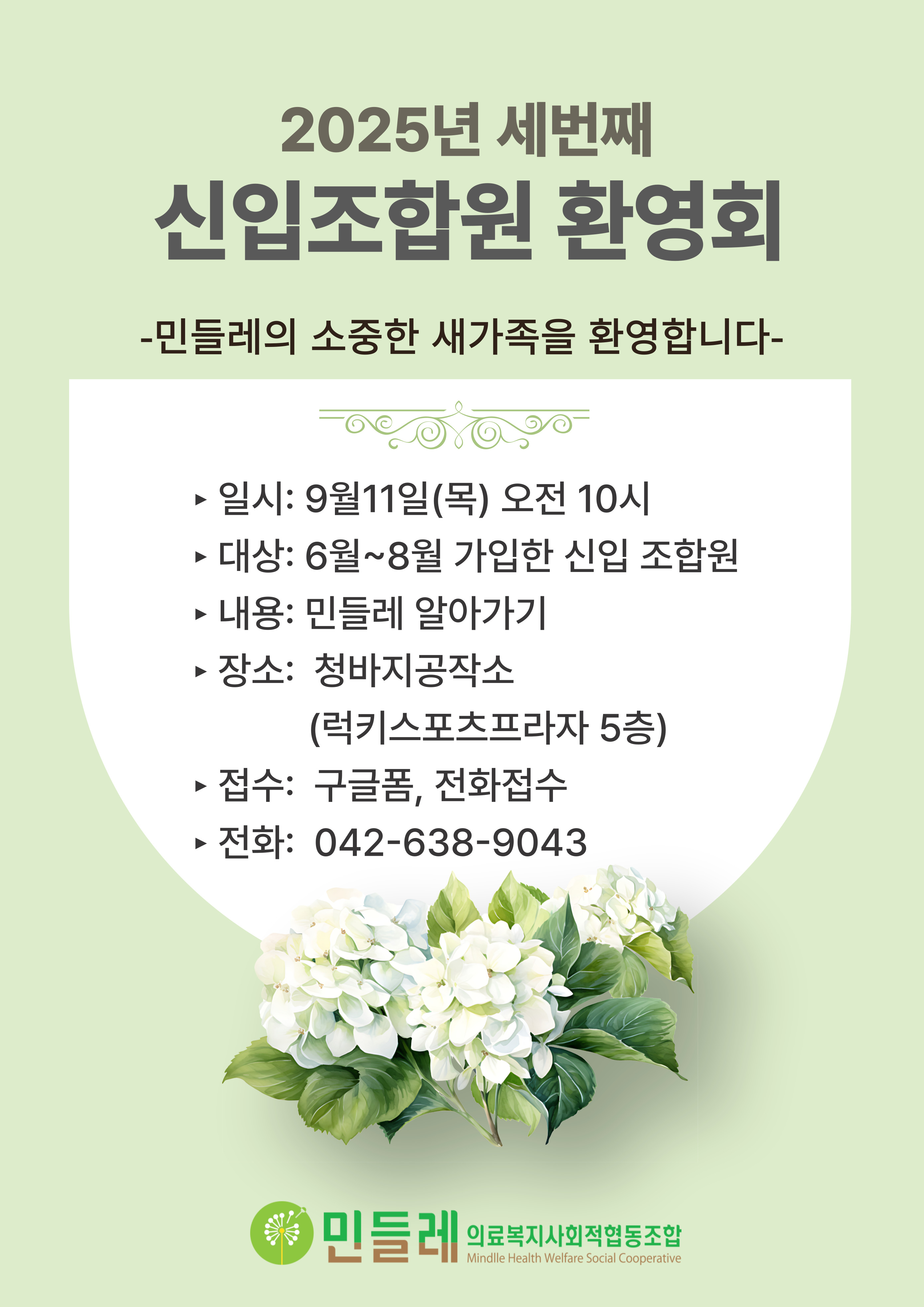 | 작성자 | 민들레의료복지사회적협동조합(mindlle) | 작성일 | 2025-09-01 | 조회수 | 4798 |