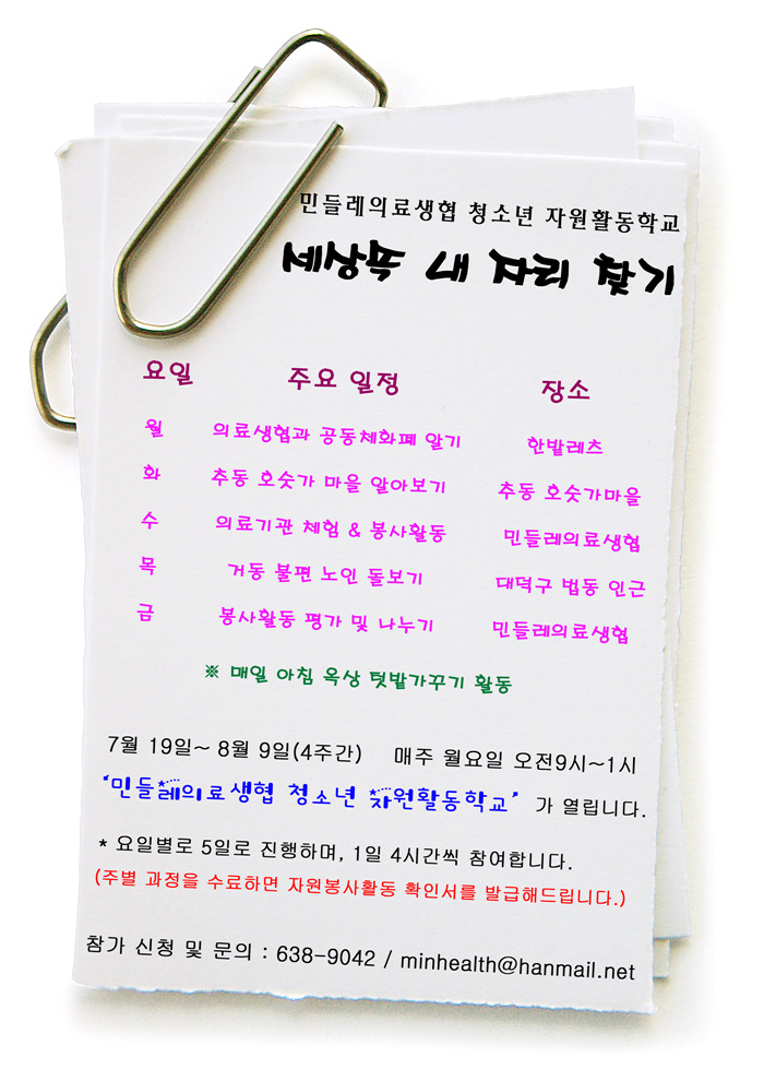 | 작성자 | 민들레의료복지사회적협동조합(mindlle) | 작성일 | 2010-08-03 | 조회수 | 21815 |