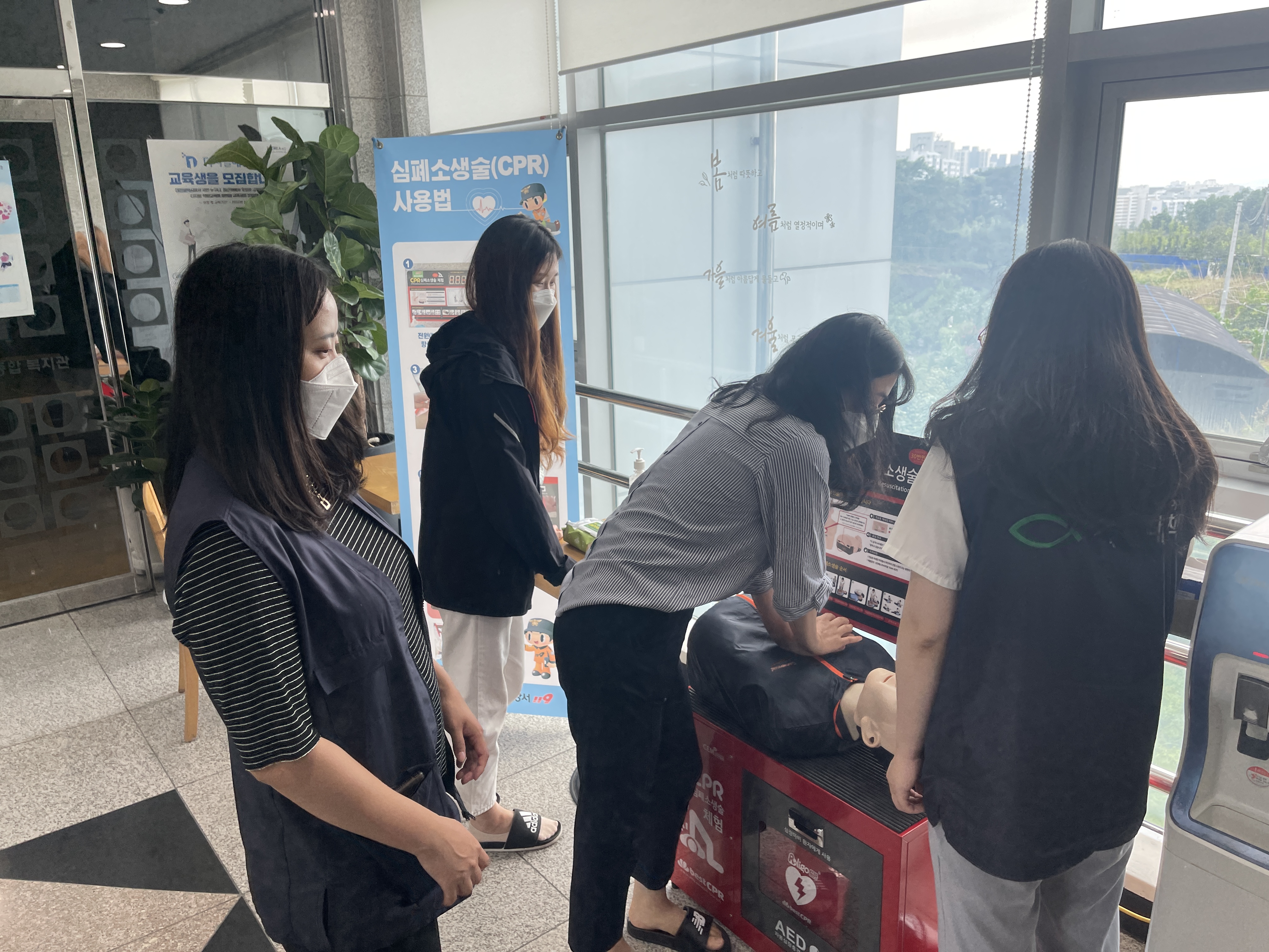 대덕소방서에서 CPR심폐소생술 체험부스를 제공하여 직접 심폐소생술을 체험하고 건강반활동 및 일상생활을 할때 응급상황 발생시 효과적인 응급대처를 할 수 있도록 한다.