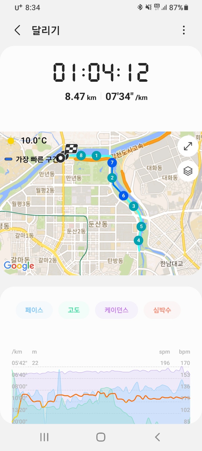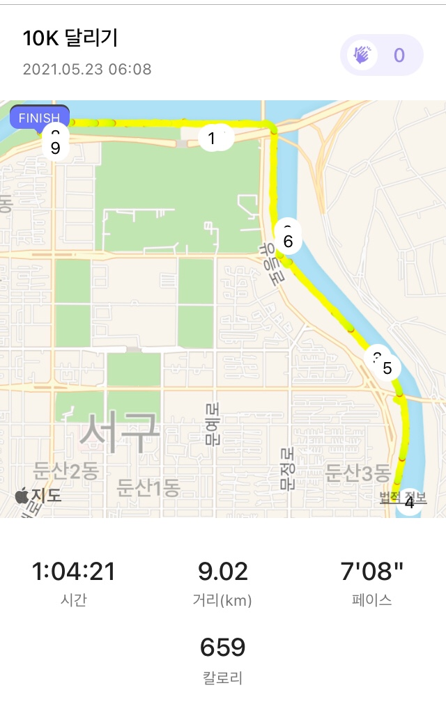 이른 아침6시30분 대덕대교 아래서 간단하게 몸풀고 인사나눈뒤 7분34초/km 페이스로 가볍게 한 시간을 뛰었다. 주위 풍경도 감상하고 간간히 얘기도 나눌 정도로 편안한 페이스로 한 시간 즐겁게 달렸다. 참석하신 분들이 몸이 가볍고 상쾌하다고 하신다. 따끈한 커피도 나눠 마시고 간단한 과일로 입을 축이고 다음 주는 해가 일찍뜨니 6시에 보자고 의견을 모으고 헤어졌다.